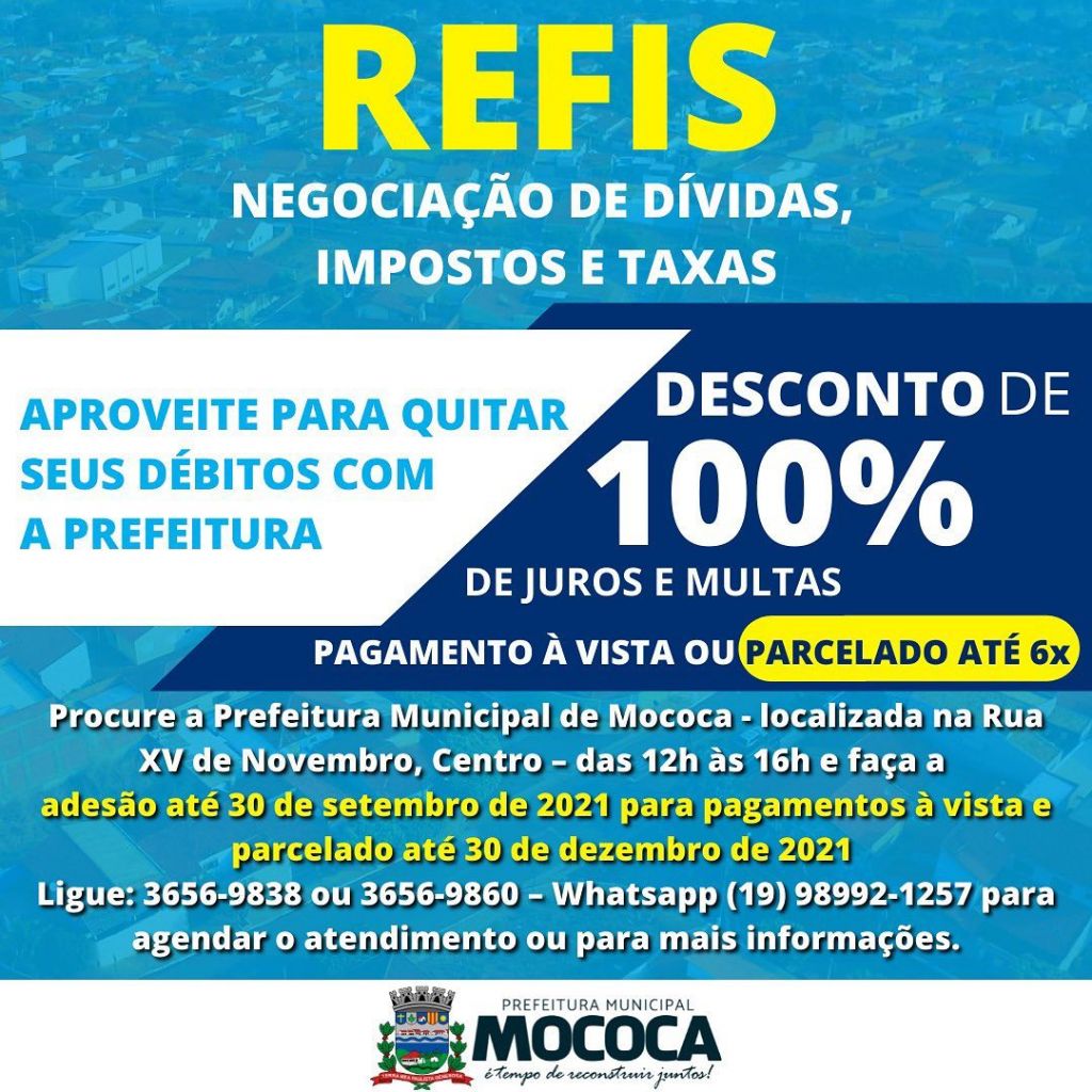 A Prefeitura Municipal de Mococa facilitou ainda mais a forma de pagamento do Refis 2021.