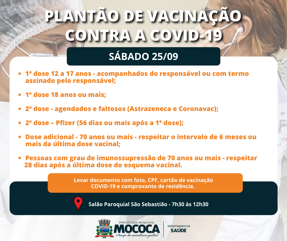 Nesta sábado dia 25/09/21, o Departamento Municipal de Saúde de Mococa, convoca a população de 18 anos ou mais que não tomou a primeira dose da vacina contra a covid-19 para comparecer nos pontos de vacinação.