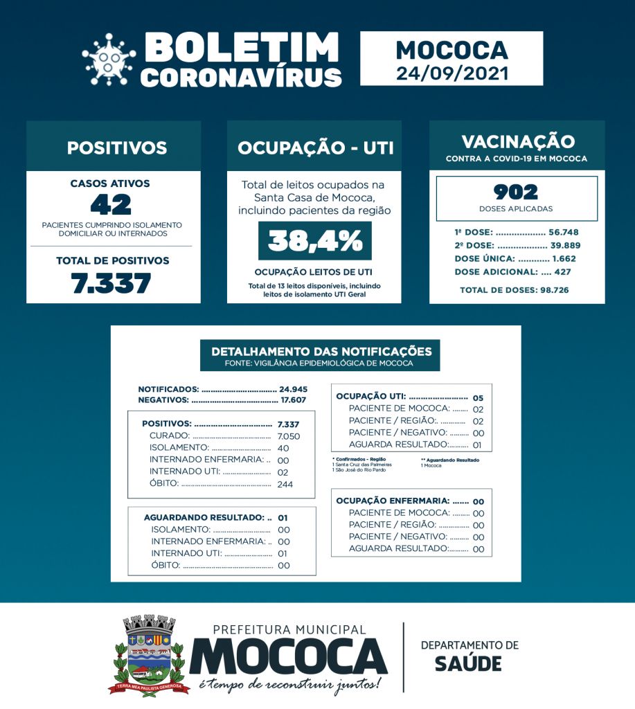 Mococa registrou nessa sexta-feira, 24, o importante índice de 60,24% da população vacinada com as duas doses da vacina contra a COVID-19. Ao todo já foram aplicadas o total de 98.726 doses, incluindo 427 doses de reforço (terceira dose do imunizante). Foram confirmados dois novos casos de coronavírus e outros 20 testaram negativo. A Vigilância Epidemiológica confirmou um óbito: paciente de 77 anos que estava internado na UTI. A taxa de ocupação da Unidade de Tratamento Intensivo está em 38,4% sendo três pacientes de Mococa, incluindo um suspeito, e outros dois da região.