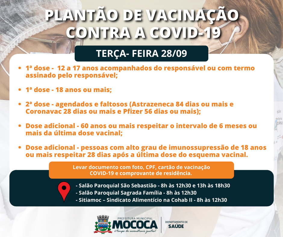 A vacinação contra a Covid-19 segue na Cidade de Mococa, confira os grupos que estão sendo vacinados.