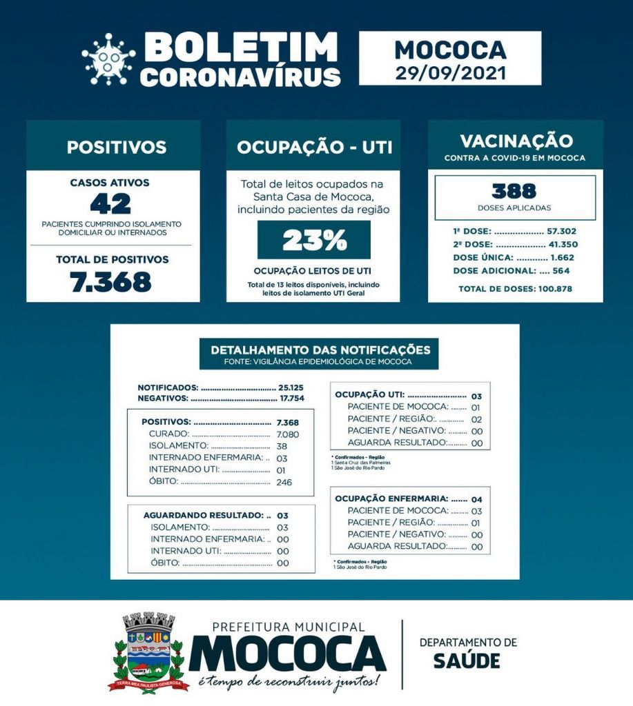 A Vigilância Epidemiológica recebeu a confirmação de dois novos casos de COVID e outros 73 exames foram testados negativos. A enfermaria está com quatro pacientes internados, sendo que um está aguardando resultado. A UTI está com índice de ocupação em 23% . Nesta quarta-feira foram aplicadas 388 doses de vacina contra o coronavírus no município.