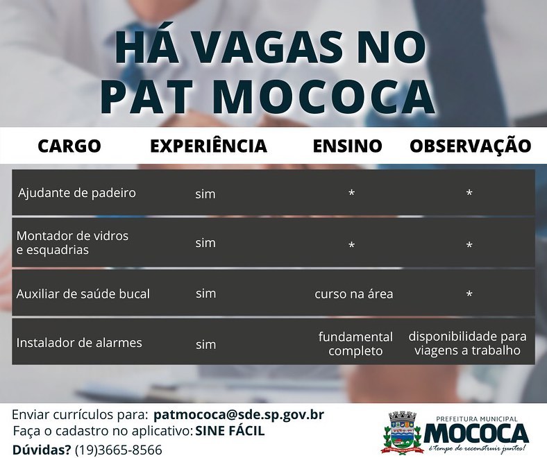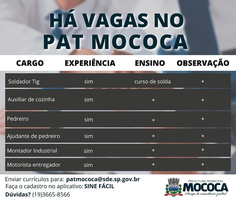 Os interessados, deverão enviar currículos para o PAT- Posto de Atendimento ao Trabalhador no e-mail: patmococa@sde.sp.gov.br
