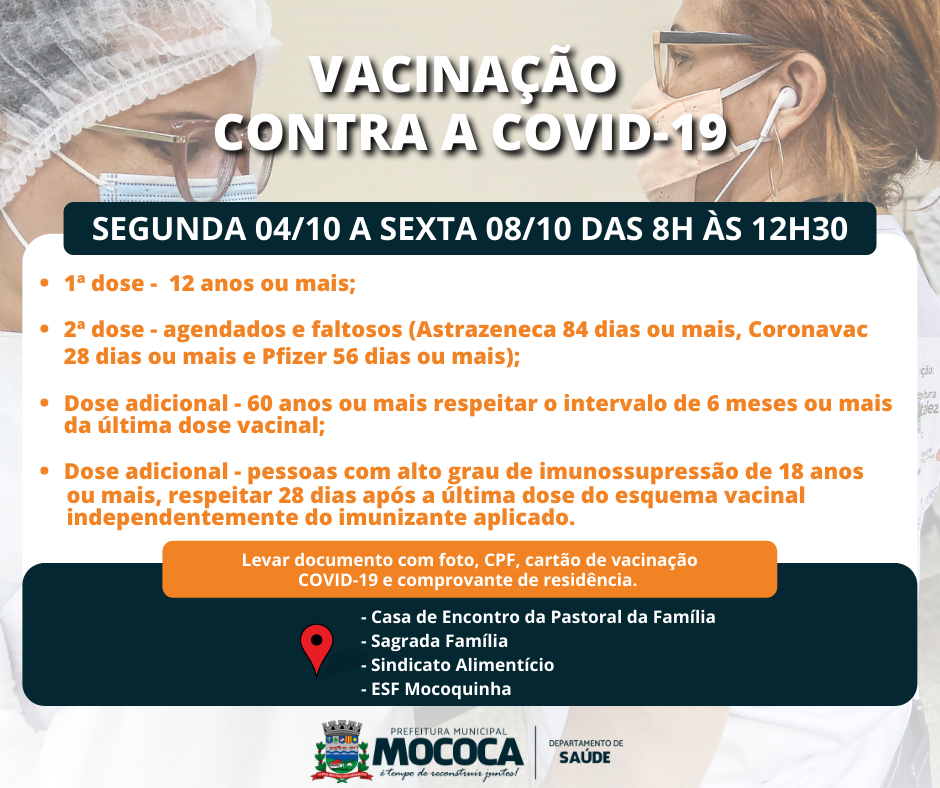 A vacinação contra a Covid-19 segue na Cidade de Mococa, confira os grupos que estão sendo vacinados.