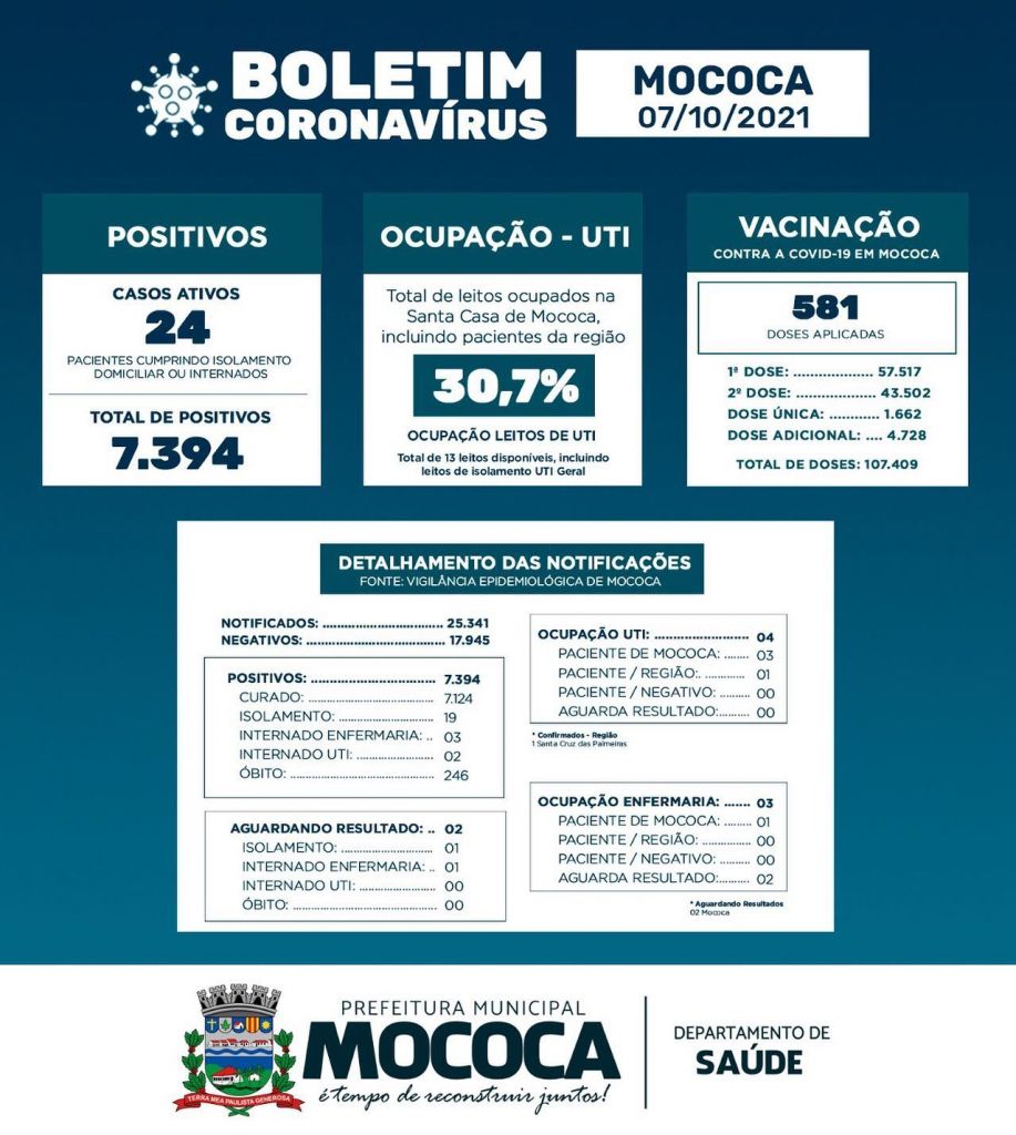 A Vigilância Epidemiológica confirmou 07 novos casos de COVID-19 e outros 32 exames foram testados negativos. A enfermaria está com três pacientes internados e nas últimas 24h houve uma alta. A UTI está índice de ocupação em 30,7%, três pacientes de Mococa e um de Santa Cruz das Palmeiras. Foram aplicadas 581 doses de vacina contra o coronavírus no município.