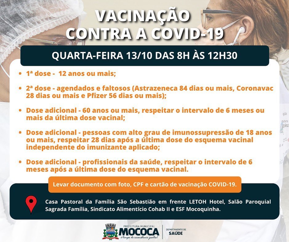 A vacinação contra a Covid-19 segue na Cidade de Mococa, confira os grupos que estão sendo vacinados.