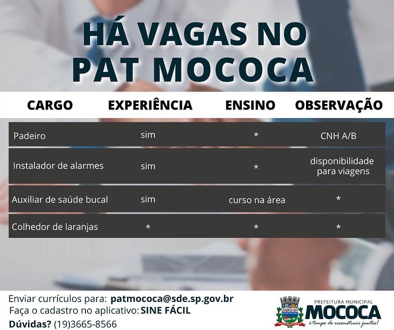 Os interessados, deverão enviar currículos para o PAT- Posto de Atendimento ao Trabalhador no e-mail: patmococa@sde.sp.gov.br