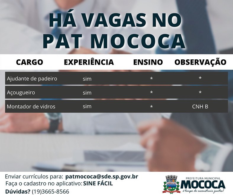 Confira as vagas disponíveis no PAT - Posto de Atendimento ao Trabalhador de Mococa.
