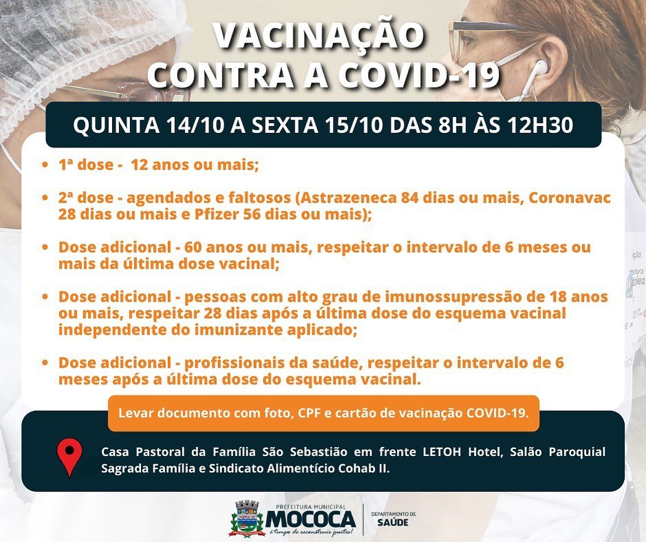 A vacinação contra a Covid-19 segue na Cidade de Mococa, confira os grupos que estão sendo vacinados.