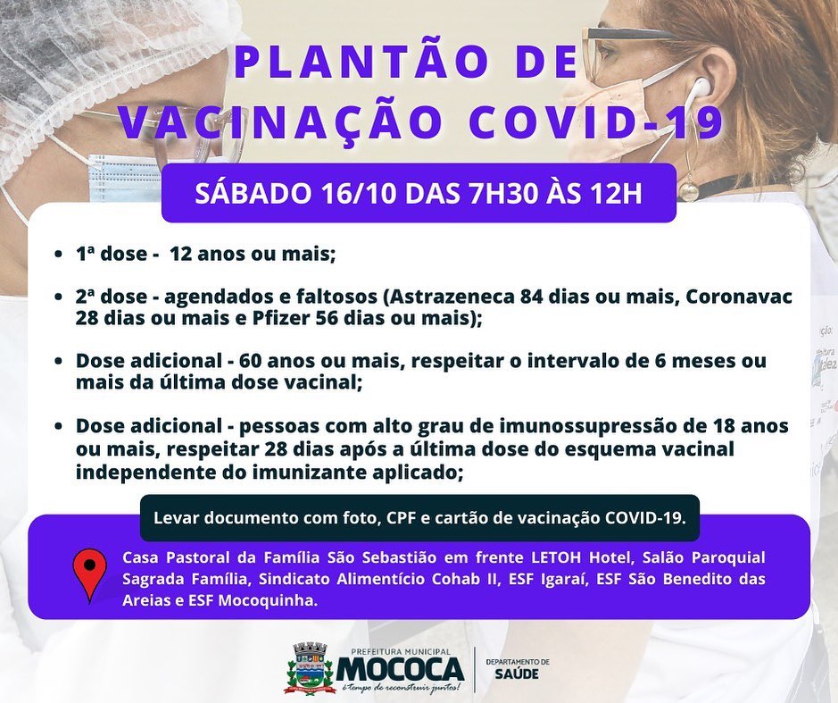 A vacinação contra a Covid-19 segue na Cidade de Mococa, confira os grupos que estão sendo vacinados neste final de semana.