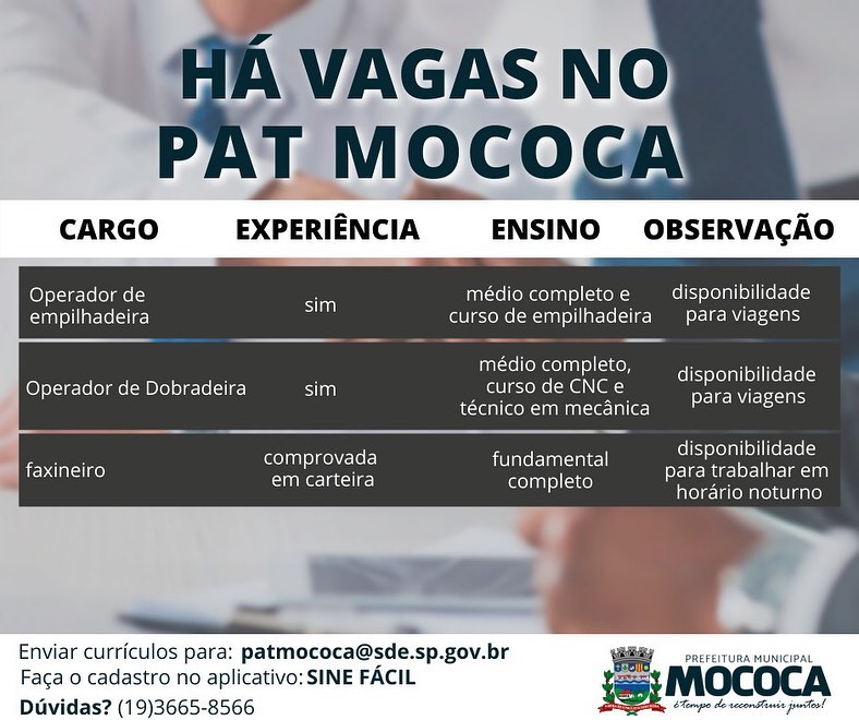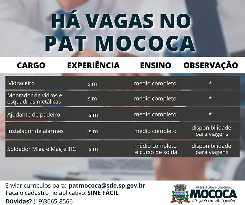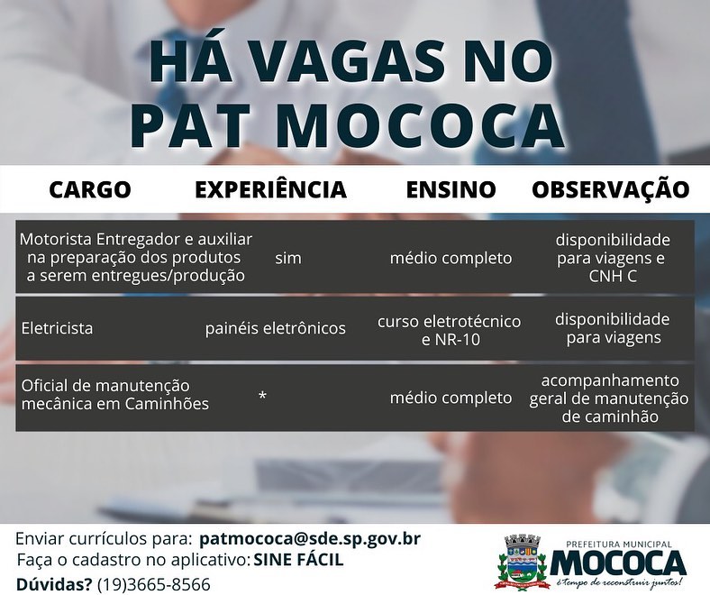 Os interessados, deverão enviar currículos para o PAT- Posto de Atendimento ao Trabalhador no e-mail: patmococa@sde.sp.gov.br