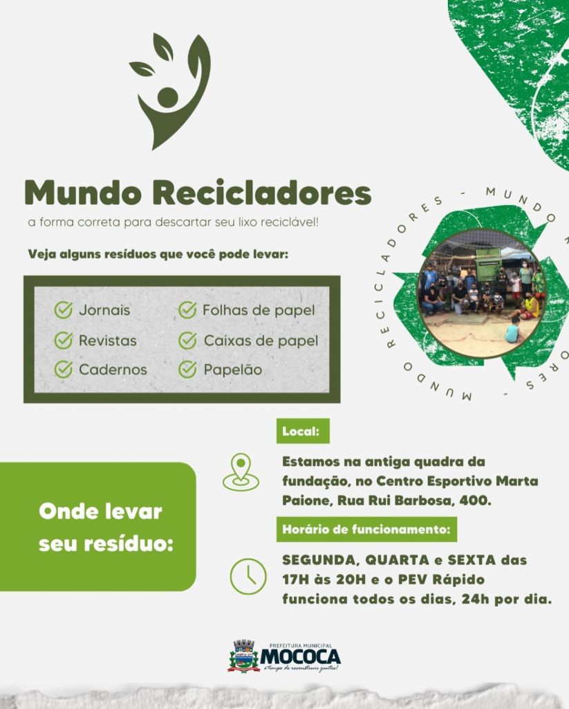 Em Mococa 1% dos resíduos recicláveis é aproveitado isso significa que enterramos diariamente pelo menos 18 toneladas de material que poderia estar gerando renda e contribuindo para a preservação dos nossos recursos naturais.