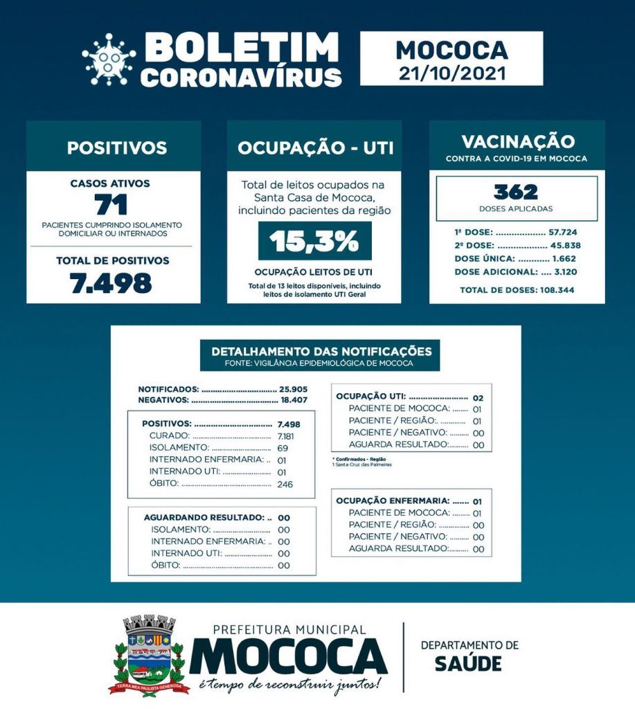 A UTI COVID-19 se mantém com 15,3% de ocupação, sendo um paciente de Mococa e outro de Santa Cruz das Palmeiras. A enfermaria está com um paciente internado. A Vigilância Epidemiológica registrou onze novos casos confirmados de coronavírus. Nesta quinta-feira foram aplicadas 362 doses de vacinas.