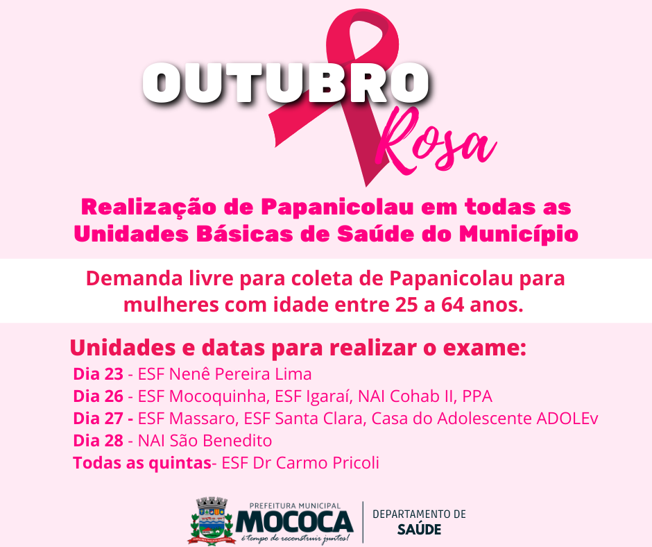 Em vista do Outubro Rosa, a Prefeitura Municipal de Mococa informa: