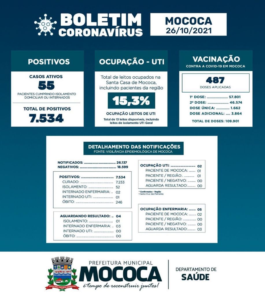 O Departamento de Saúde divulgou que cerca de 70% da população mocoquense em idade vacinal já recebeu as duas doses ou dose única de imunizantes contra a COVID-19. Nesta terça-feira foram vacinadas 487 pessoas. A Vigilância Epidemiológica confirmou dezoito novos casos de coronavírus e outros oitenta e um foram estados negativos. A UTI se mantém com taxa de ocupação em 15,3% e a enfermaria está com cinco pacientes internados, sendo dois confirmados e três aguardando resultado.