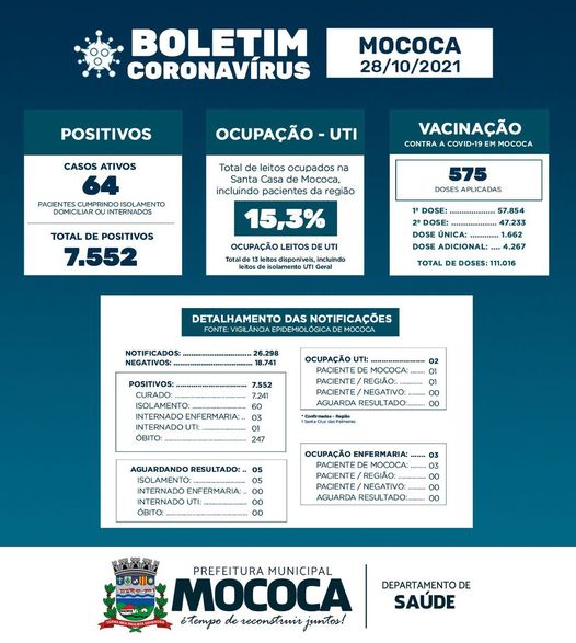 A Vigilância Epidemiológica confirmou 12 novos casos positivos e outros 68 foram testados negativos para COVID-19. A UTI COVID-19 se mantém com 15,3% da capacidade, sendo um paciente de Mococa e outro da região. Na enfermaria estão três pacientes internados. Nesta quinta-feira foram aplicadas 575 doses de vacinas contra o coronavírus.