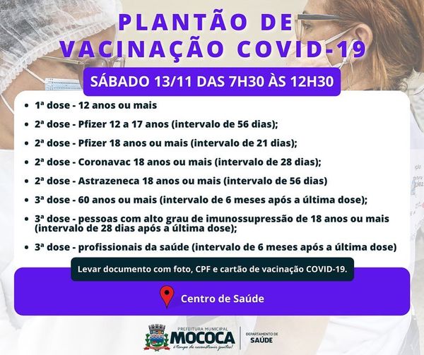 Neste sábado 13/11 ocorrerá Plantão Vacinação Contra COVID-19 confira grupos e os locais de vacinação na postagem!