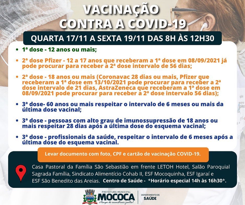 A vacinação contra a Covid-19 segue na Cidade de Mococa, confira os grupos que estão sendo vacinados.