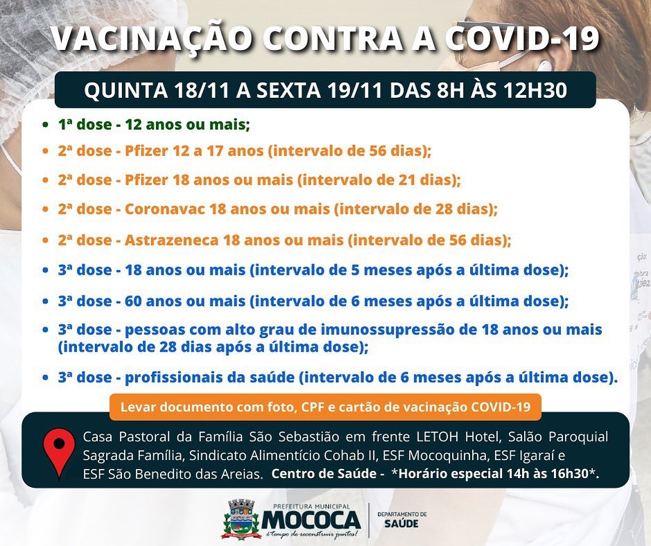 A vacinação contra a Covid-19 segue na Cidade de Mococa, confira os grupos que estão sendo vacinados.