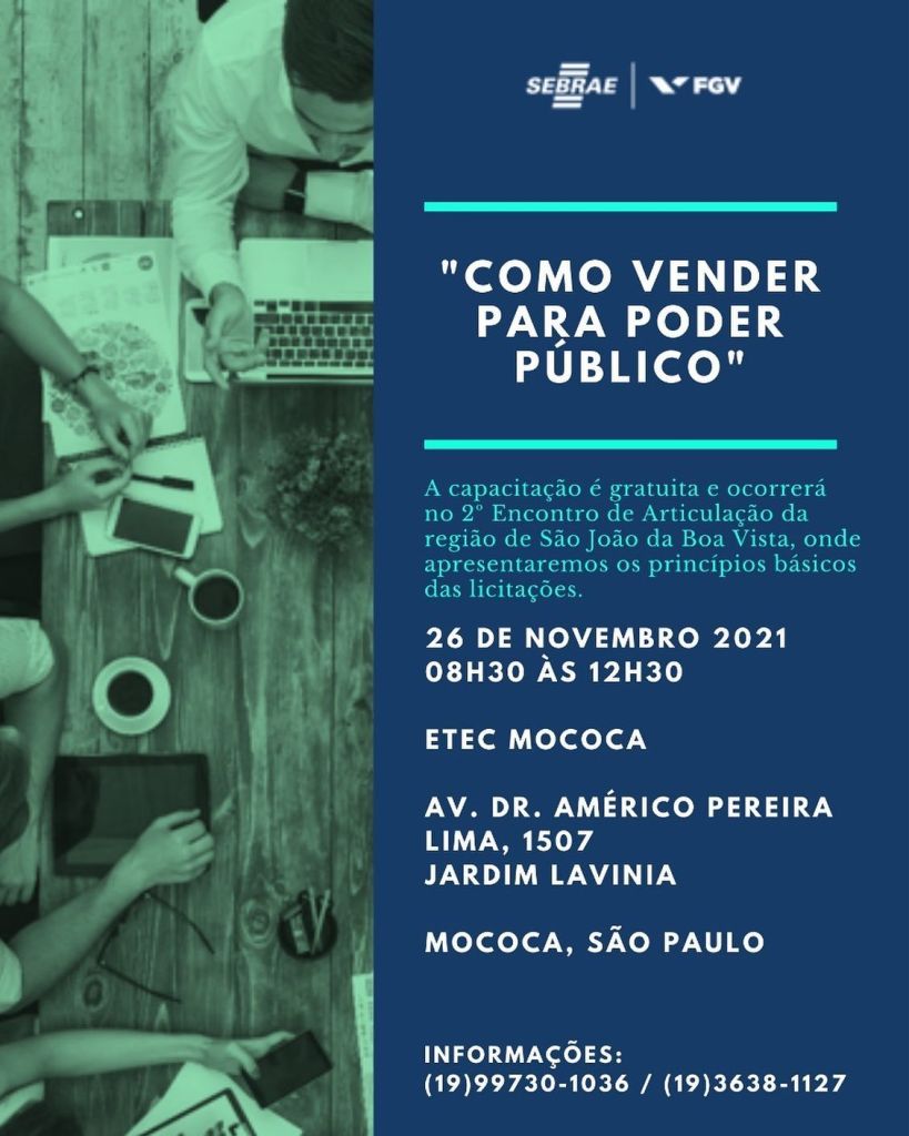 A capacitação é gratuita e ocorrerá no 2º Encontro de Articulação da Região de São João da Boa Vista, onde apresentaremos os princípios básicos das licitações: O que são Compras Públicas; Benefícios da lei para os MEIs, Micro e Pequenas Empresas; Tipos de Licitações e como participar de forma simples e prática utilizando o Portal de Compras Públicas.