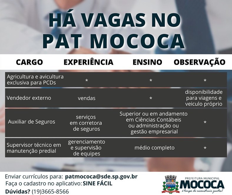 Os interessados, deverão enviar currículos para o PAT- Posto de Atendimento ao Trabalhador no e-mail: patmococa@sde.sp.gov.br