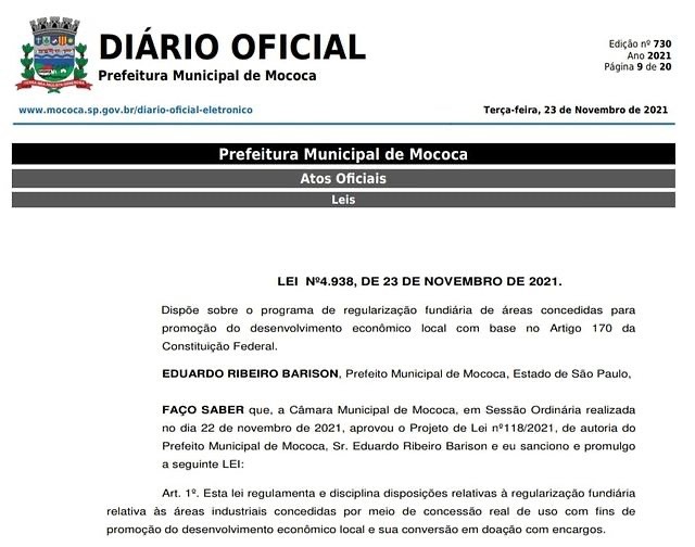A Lei nº4.938 que foi votada pelos vereadores da Câmara Municipal e sancionada pelo prefeito Eduardo Barison fazia parte de uma demanda que há muito tempo era solicitada e agora, possibilitará a regularização das áreas dos Distritos Industriais, novos investimentos, expansão e geração de emprego e renda para Mococa, possibilitando ainda maior competitividade regional.