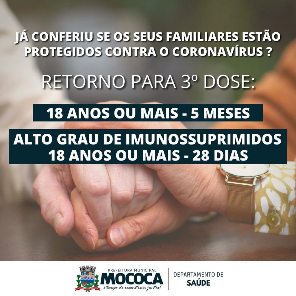 A Prefeitura Municipal de Mococa através do Departamento de Saúde informa que foram registrados mais de 5 mil faltosos para a 2ªdose a partir da soma das doses AstraZeneca, Coronavac e Pfizer; e também mais de 4 mil faltosos para 3ª dose.