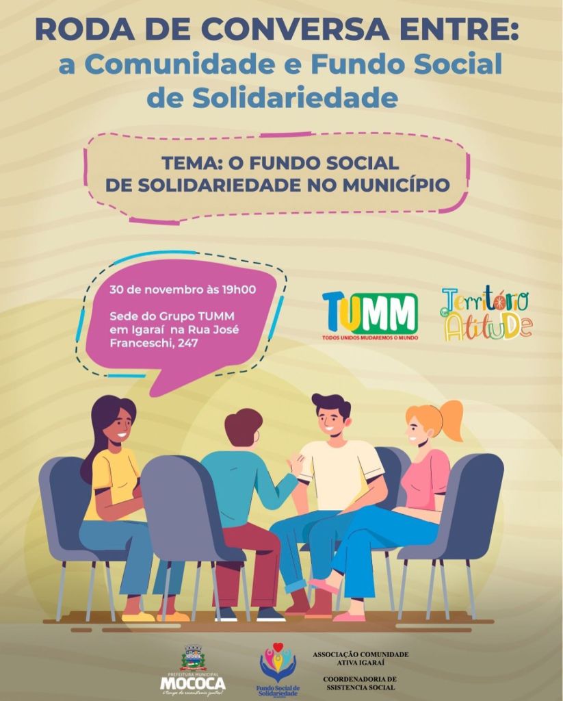 A Prefeitura Municipal de Mococa através do Fundo Social de Solidariedade comunica que será realizada uma roda de conversa entre a instituição e a comunidade em Igaraí, com o tema: Fundo Social de Solidariedade no Município.