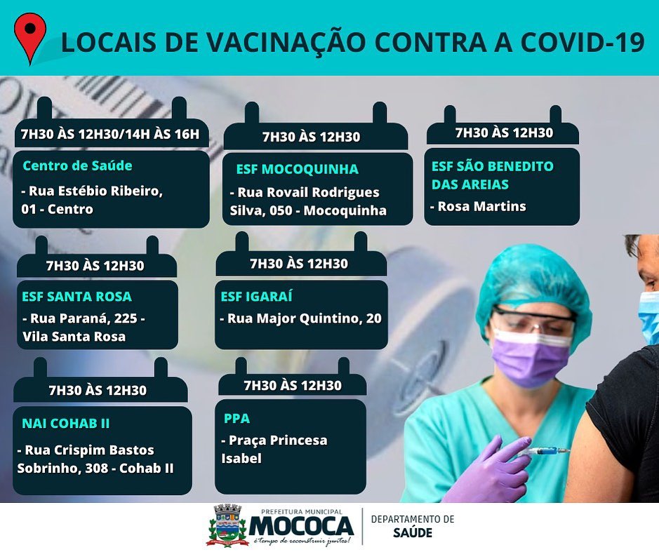 A Prefeitura Municipal de Mococa através do Departamento de Saúde informa à respeito da localização dos novos locais de vacinação na cidade: