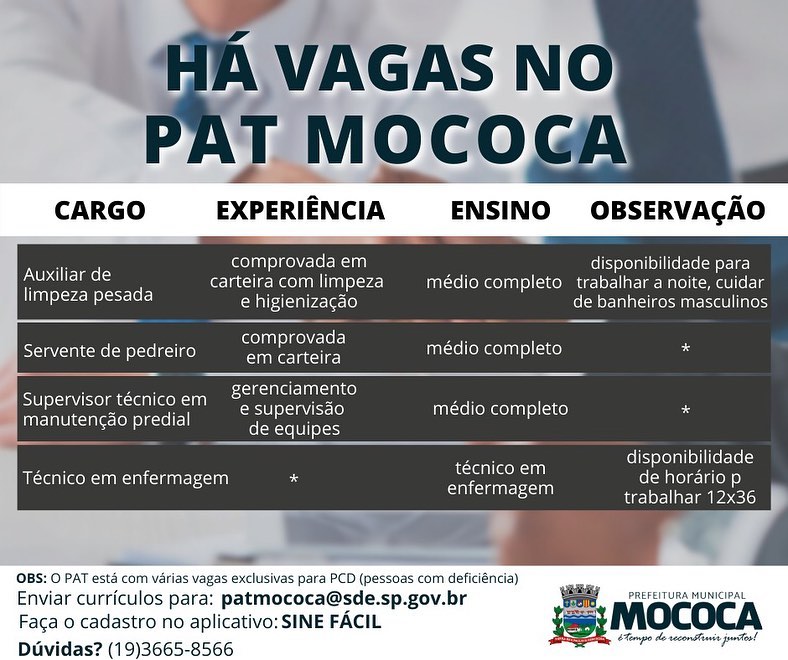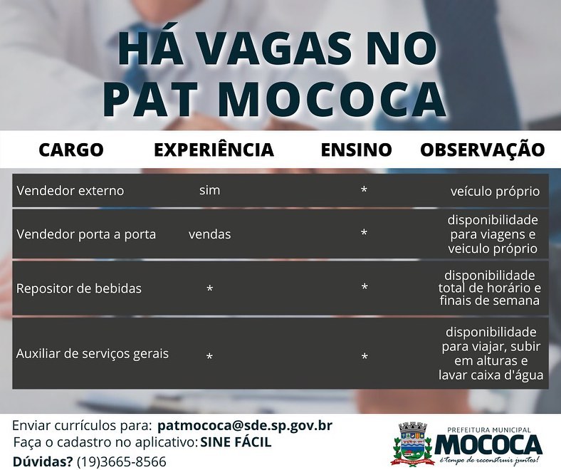 Os interessados, deverão enviar currículos para o PAT- Posto de Atendimento ao Trabalhador no e-mail: patmococa@sde.sp.gov.br