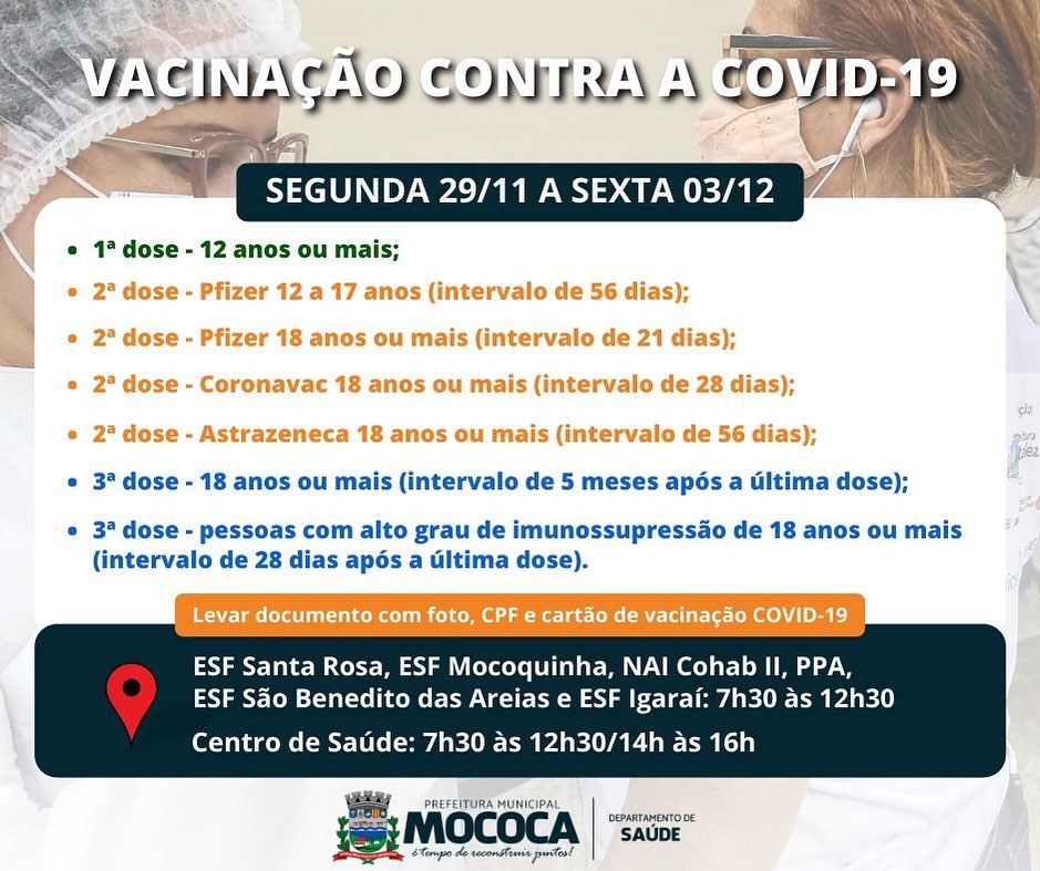A vacinação contra a Covid-19 segue na Cidade de Mococa, confira os grupos que estão sendo vacinados.