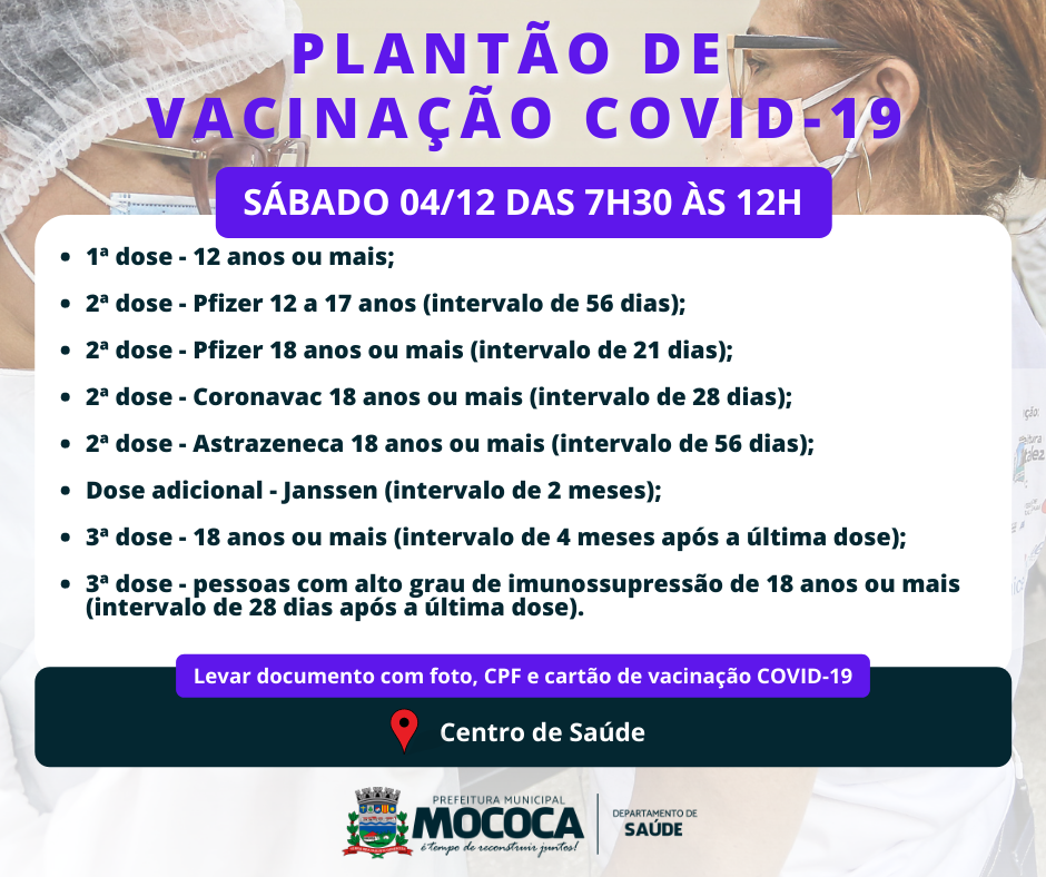 A Prefeitura Municipal de Mococa informa que haverá plantão de vacinação neste final de semana.