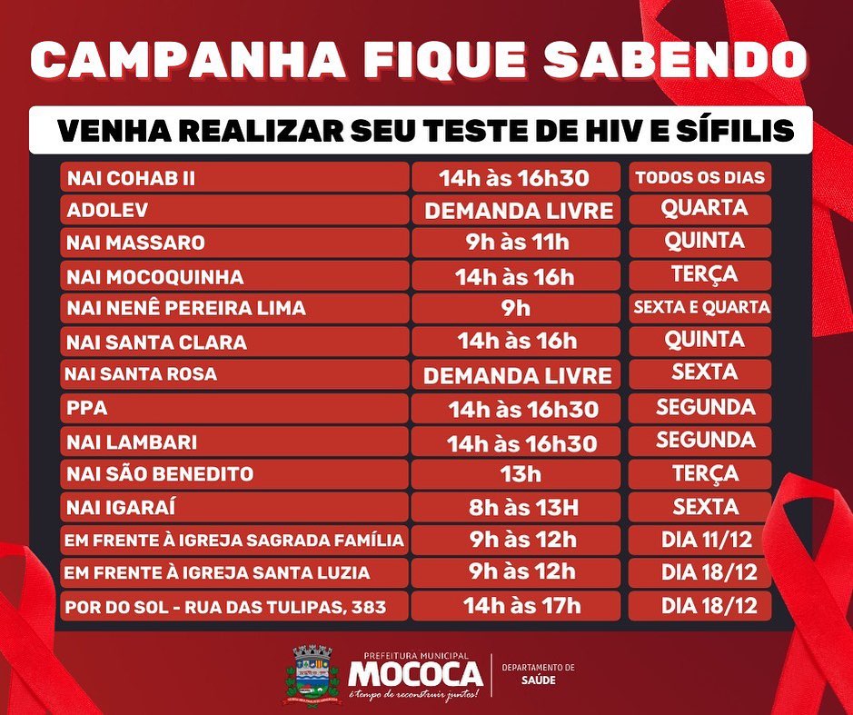 A Prefeitura Municipal de Mococa em prol do Dezembro Vermelho, mês nacional de prevenção ao HIV/AIDS e outras Infecções Sexualmente Transmissíveis, lembra que o Departamento de Saúde via o SAE estão realizando a campanha “Fique Sabendo”, com a realização de testes de HIV E Sífilis com profissionais capacitados e que prezam pelo sigilo e confiabilidade do diagnóstico.