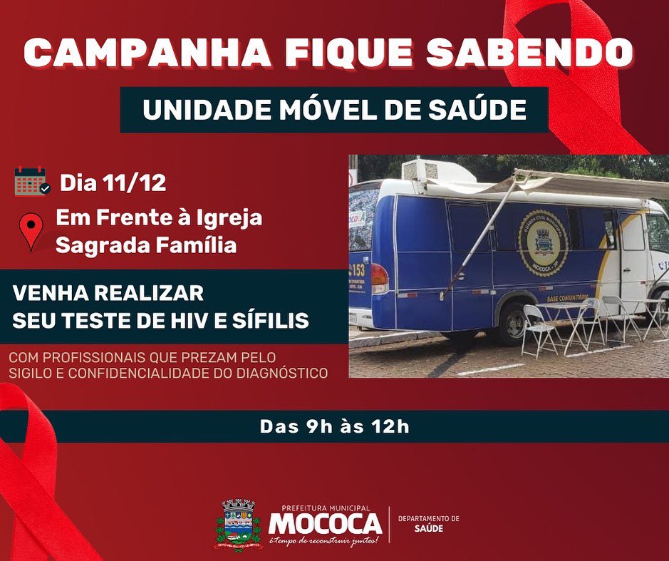 O Departamento de Saúde de Mococa está realizando junto ao o SAE – Serviço de Assistência Especializada a 14ª Campanha “Fique Sabendo”, no combate as IST’s - Infecções Sexualmente Transmissíveis e no dia 18/12 estará com sua unidade móvel em frente à Igreja Santa Luzia das 9h às 12h e no Bairro Por do Sol na Rua das Tulipas, 383 das 14h às 17h.