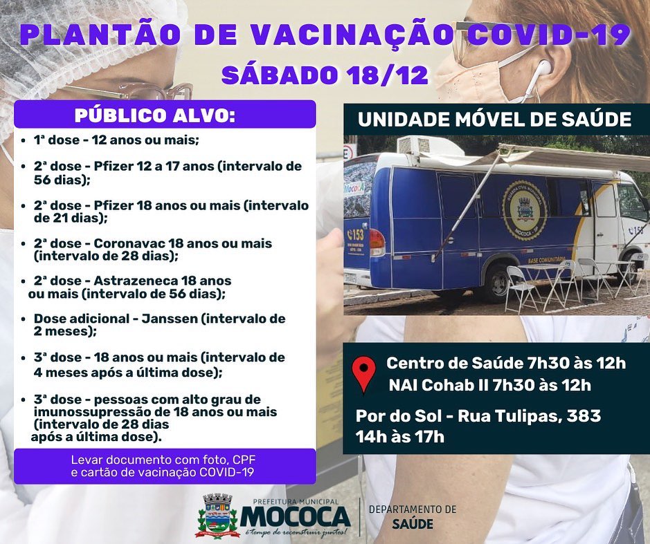 PLANTÃO DE VACINAÇÃO CONTRA A COVID-19 NESTE SÁBADO 18/12