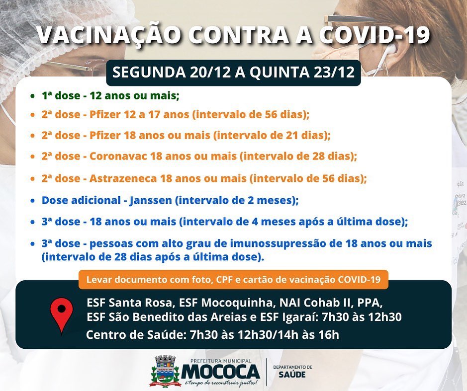 VACINAÇÃO CONTRA A COVID-19 EM MOCOCA – SEGUNDA 20/12 a QUINTA 23/12