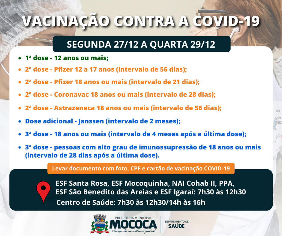 VACINAÇÃO CONTRA A COVID-19 EM MOCOCA – SEGUNDA 27/12 A QUARTA 29/12