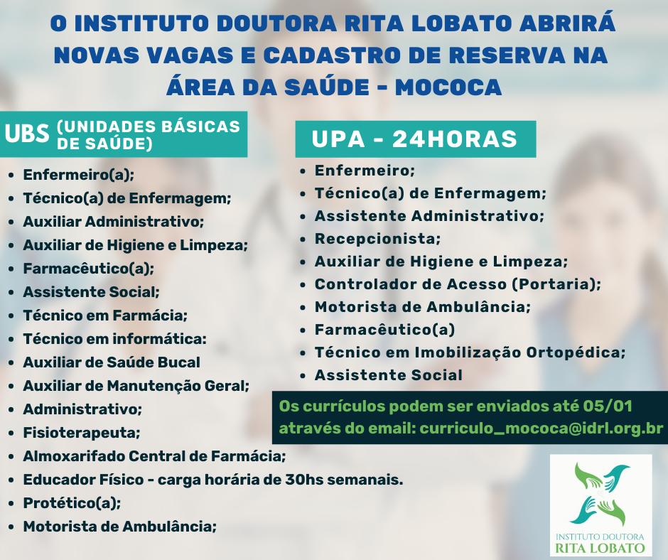 O Instituto Doutora Rita Lobato abrirá novas vagas e cadastro de reserva na área da saúde para as UBS e na UPA na cidade de Mococa.