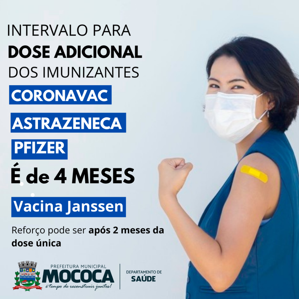 A Prefeitura Municipal de Mococa através do Departamento de Saúde informa que as vacinas Coronavac, AstraZeneca e Pfizer podem ter o reforço aplicado a partir de quatro meses após a 2ª dose.