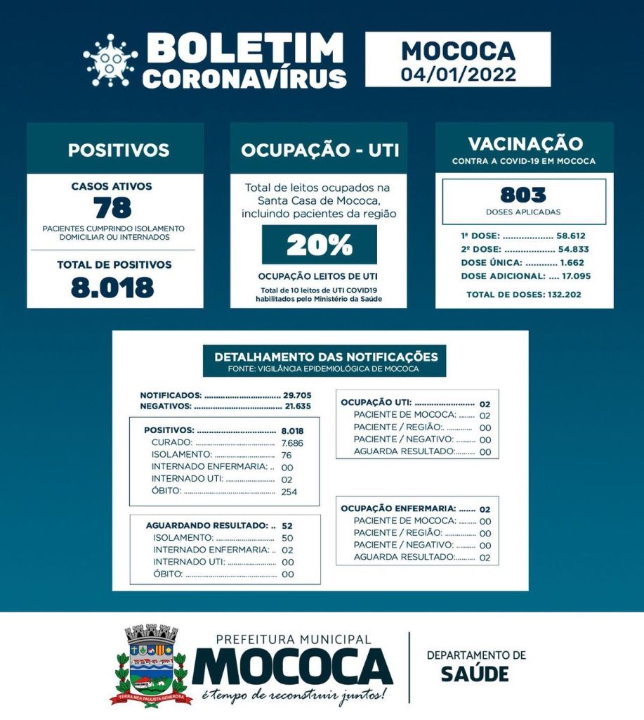 Foram aplicadas 803 doses de vacinas contra a COVID-19, sendo 180 na tarde de ontem e 623 na manhã dessa terça-feira. A UTI COVID-19 se mantém com 20% de ocupação, sendo dois pacientes de Mococa. Na enfermaria, dois pacientes suspeitos estão internados. Confirmados 65 novos casos e outros 85 foram testados negativos para COVID-19.