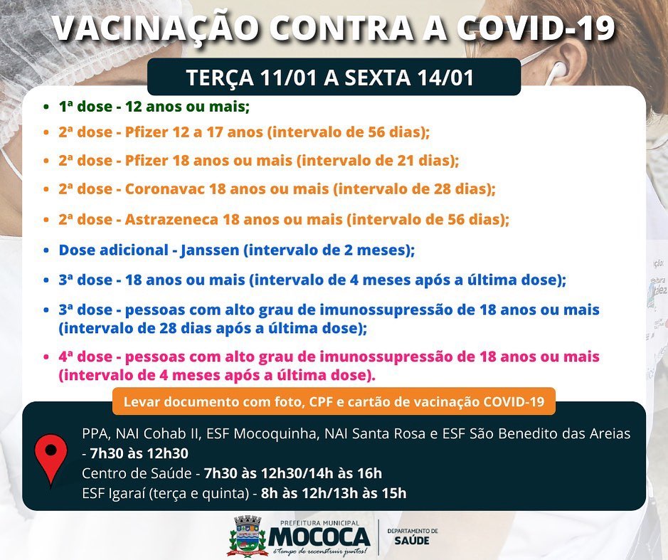 A vacinação contra a Covid-19 segue na Cidade de Mococa, confira os grupos que estão sendo vacinados.