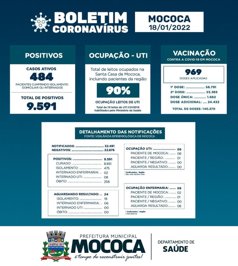 A Vigilância Epidemiológica registrou 84 novos casos positivos de COVID-19 e 273 foram testados negativos. A UTI COVID-19 está com 90% de ocupação, sendo oito pacientes confirmados de Mococa e um de São João da Boa Vista. Na enfermaria, dois pacientes positivos estão internados e outros seis aguardam resultados de exame. Há um paciente de Casa Branca internado.