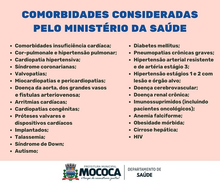 Insuficiência cardíaca; Cor-pulmonale e hipertensão pulmonar;Cardiopatia hipertensiva; Síndrome coronarianas; Valvopatias; Miocardiopatias e pericardiopatias; Doença da aorta, dos grandes vasos e fistulas arteriovenosa; Arritmias cardíacas; Cardiopatias congênitas; Próteses valvares e dispositivos cardíacos, Implantados; Talassemia; Síndrome de Down; Autismo; Diabetes mellitus; Pneumopatias crônicas graves; Hipertensão arterial resistente e de artéria estágio 3; Hipertensão estágios 1 e 2 com lesão e órgão alvo; Doença cerebrovascular; Doença renal crônica; Imunossuprimidos (incluindo pacientes oncológicos); Anemia falciforme; Obesidade mórbida; Cirrose hepática; HIV.