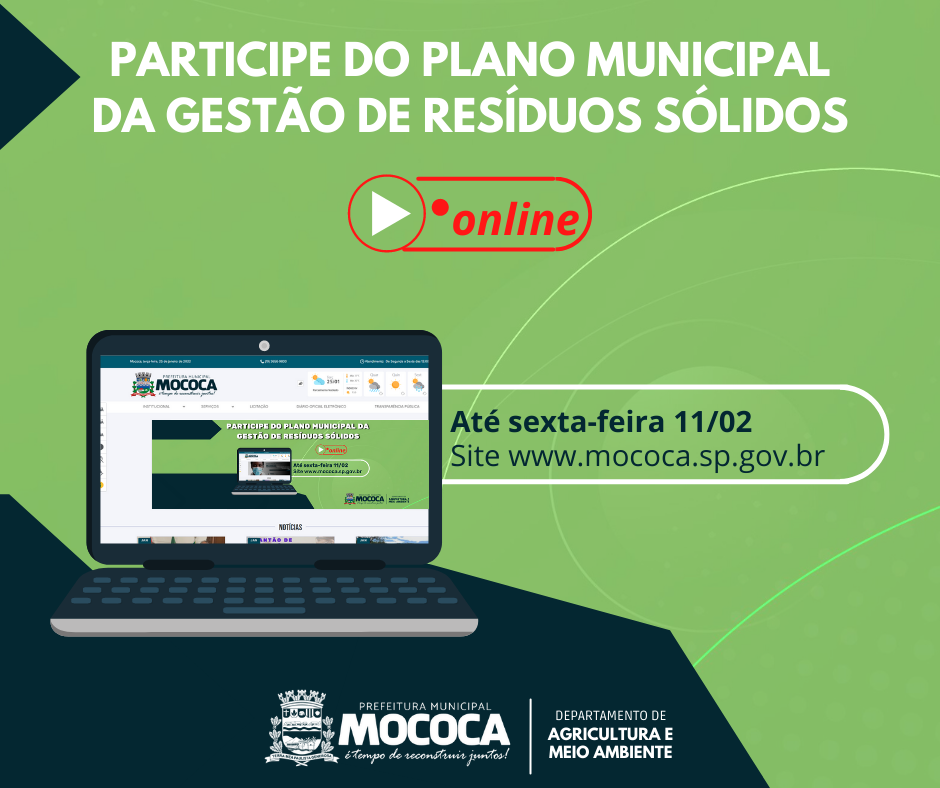 A Prefeitura Municipal de Mococa junto da coordenadoria do Meio Ambiente vêm através desta apresentar para a população da cidade o Plano Municipal de Gestão Integrada de Resíduos Sólidos.