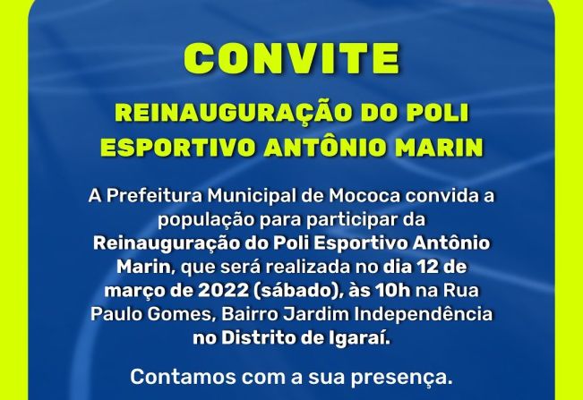 A Prefeitura Municipal de Mococa convida toda a população para prestigiar a reinauguração do Poli Esportivo Antônio Marin, que será realizado no dia 12 de março, às 10h na Rua Gomes, Bairro Jardim Independência no Distrito de Igaraí.