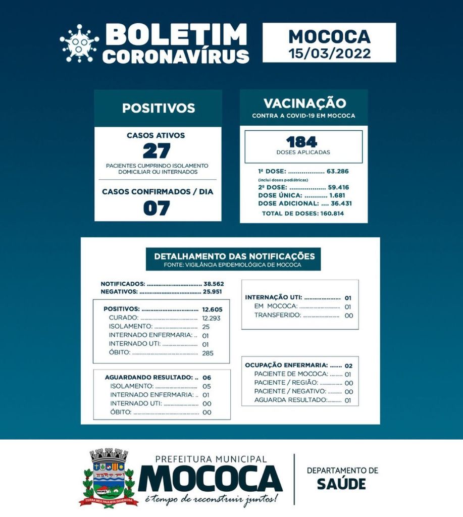 Foram confirmados 07 casos positivos de COVID-19 no município e outros 39 foram testados negativos. Um paciente de Mococa está internado em leito de UTI na Santa Casa e dois na enfermaria, sendo um confirmado e outro suspeita. Atualmente existem 27 casos ativos confirmados de COVID-19 no município. Nessa segunda-feira foram aplicadas 184 doses de vacinas.