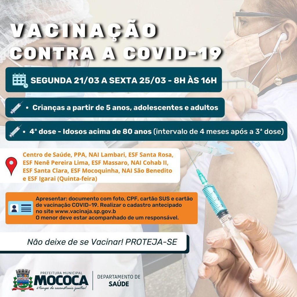 A vacinação contra a Covid-19 segue na Cidade de Mococa, confira os grupos que estão sendo vacinados.