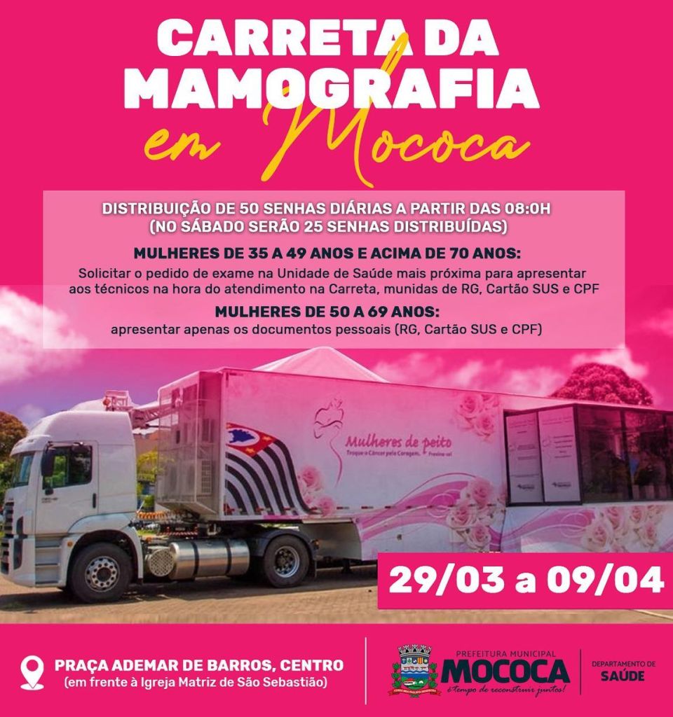 MOCOCA RECEBERÁ A CARRETA DA MAMOGRAFIA A PARTIR DA PRÓXIMA TERÇA-FEIRA, 29 A partir da próxima semana, a cidade de Mococa receberá a “Carreta da Mamografia” através do programa estadual ‘Mulheres de Peito’. A carreta será fixada na Praça Ademar de Barros, centro, em frente à Igreja da Matriz e os procedimentos começarão na terça-feira, 29/03. Serão dez dias de atendimentos (até 09/04), sendo 50 mulheres atendidas por dia, mediante distribuição diária de senha a partir das 08:00h. No sábado, 02/04, serão 25 senhas distribuídas. Os exames de mamografia serão realizados gratuitamente. - mulheres de 35 a 49 anos: precisam procurar a unidade de saúde mais próxima de casa e solicitar o pedido de exame para apresentar aos técnicos na hora do atendimento na Carreta, munidas de RG, Cartão SUS e CPF; - mulheres 50 a 69 anos: apresentar apenas os documentos pessoais (RG, Cartão SUS e CPF) - mulheres acima de 70 anos: precisam procurar a unidade de saúde mais próxima de casa e solicitar o pedido de exame para apresentar aos técnicos na hora do atendimento na Carreta, munidas de RG, Cartão SUS e CPF; Detecção precoce Na mais recente estimativa mundial, o câncer de mama é o segundo mais incidente no mundo e a primeira causa de morte por câncer entre mulheres. Segundo dados do Instituto Nacional do Câncer (INCA), o cenário se repete no Brasil: é também o tipo mais incidente em mulheres e a causa mais frequente de morte por câncer nessa população. A detecção precoce do câncer tem papel destacado nas estratégias de controle da doença – quanto mais cedo for identificado, maiores são as chances de cura. No caso do câncer de mama, a Organização Mundial de Saúde (OMS) e o Ministério da Saúde, baseando-se em estudos que apontam maior incidência da doença e eficiência do exame, sugerem que a mamografia de rastreamento seja realizada a cada dois anos em mulheres na faixa etária de 50 a 69 anos. Diante das evidências conclusivas de eficácia, maior impacto na redução da mortalidade e melhor balanço entre riscos e benefícios dessa estratégia para esse grupo etário, esse é o público prioritário para realização do exame, mas as mulheres fora dessa faixa que apresentarem pedido médico também serão atendidas.