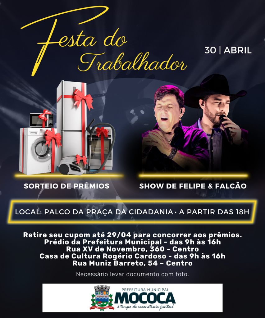 A Prefeitura Municipal de Mococa anuncia que realizará a Festa do Trabalhador. A comemoração acontecerá no Palco das Quadras da Cidadania no dia 30 de abril, a partir das 18horas, com sorteio de prêmios e show de Felipe e Falcão.