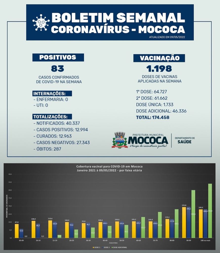 De acordo com a Vigilância Epidemiológica, durante a semana foram registrados 83 casos positivos de COVID-19 no município de Mococa. Não há pacientes internados. Foram aplicadas 1.198 doses de vacinas contra o coronavírus no período.