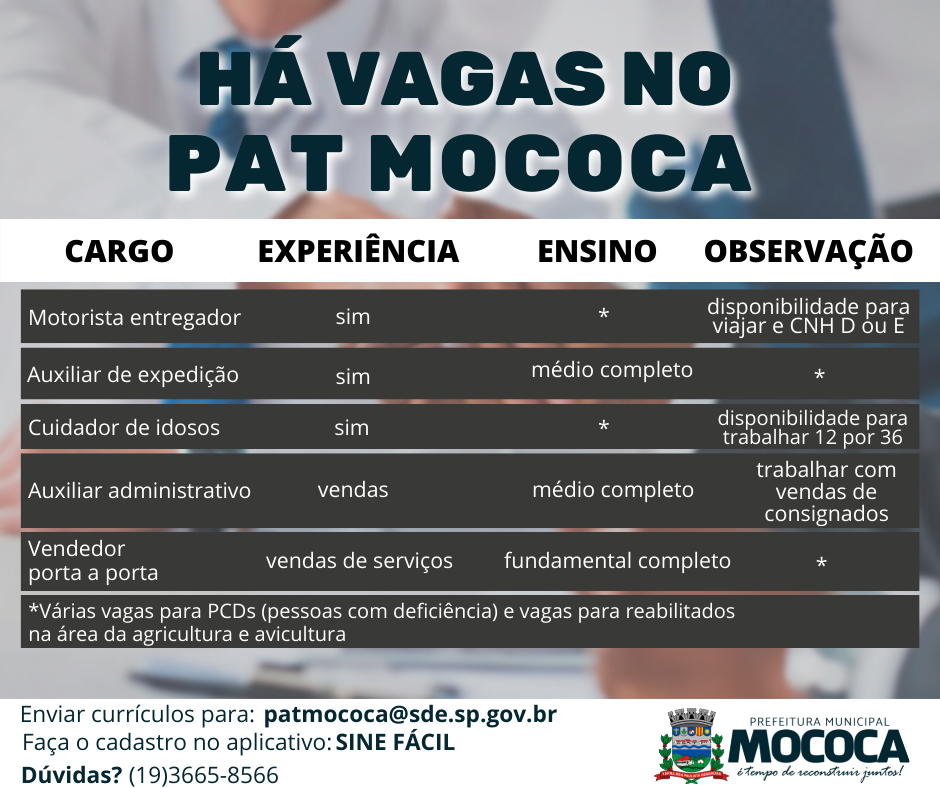 Confira as vagas disponíveis no PAT - Posto de Atendimento ao Trabalhador de Mococa.